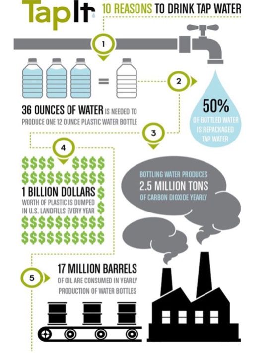 Why buy bottled water and not rely upon more environmentally friendly methods, such as home filtration systems, like Brita or Pur? Even these methods give much more assurance that the water has undergone adequate treatment for contaminants. As the infograph above depicts, 50% of bottled water is actually repackaged tap.